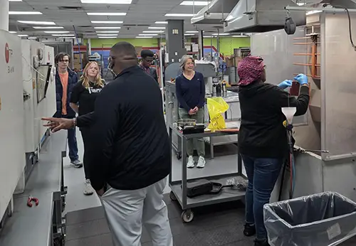 Students were shown how polymers were tested for their tensile strength and the fact that if the desired strength isn't met, the starting material is reusable in the starting process to attempt to waste as little as possible. The tour used terms such as glass transition temperature (AKA Tg) and curing within an industrial setting to introduce career paths available to chemistry graduates beyond the lab. The tour was led by Donovan Maulden the HR Administrator and the Product Development Manager Tony Myrick.