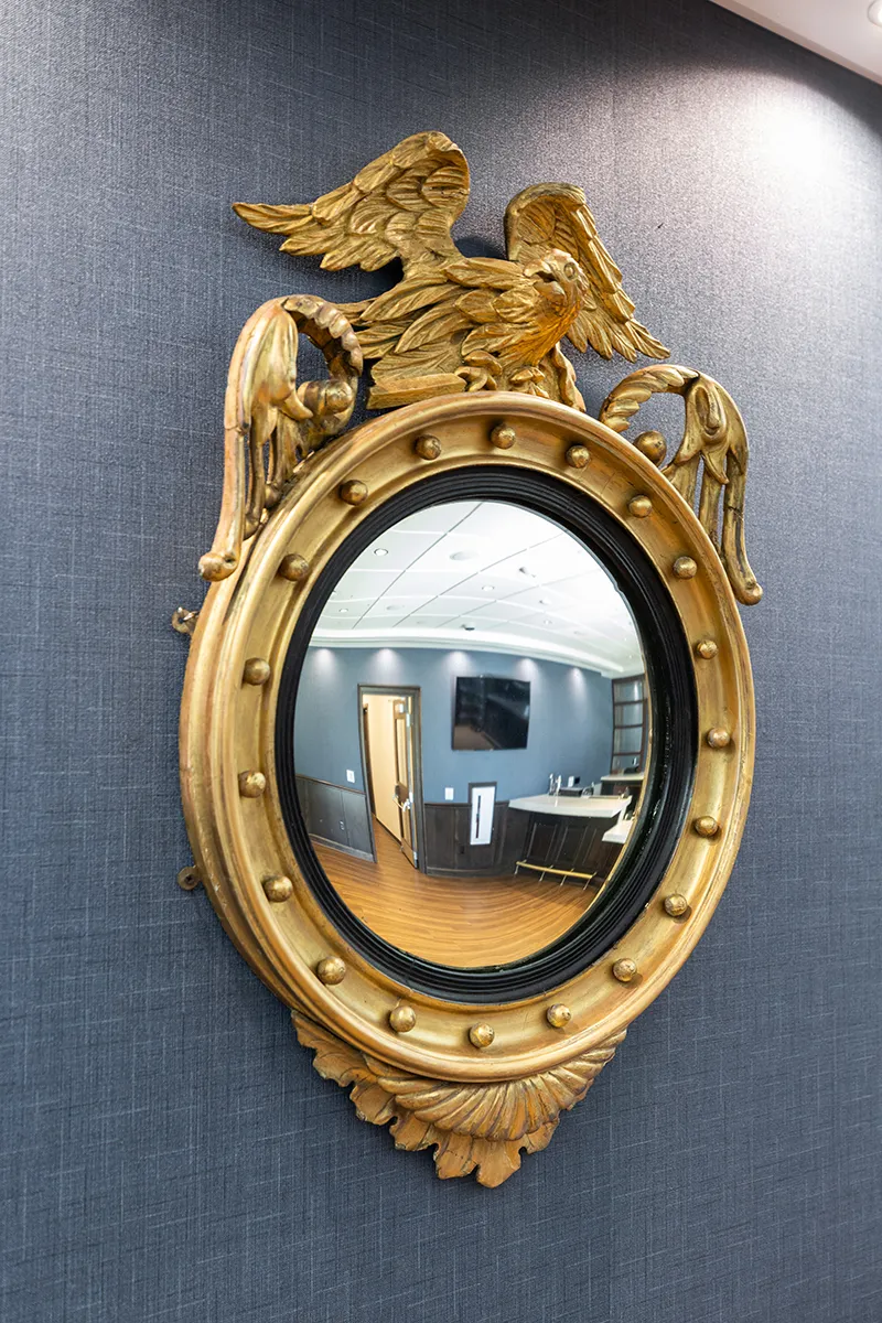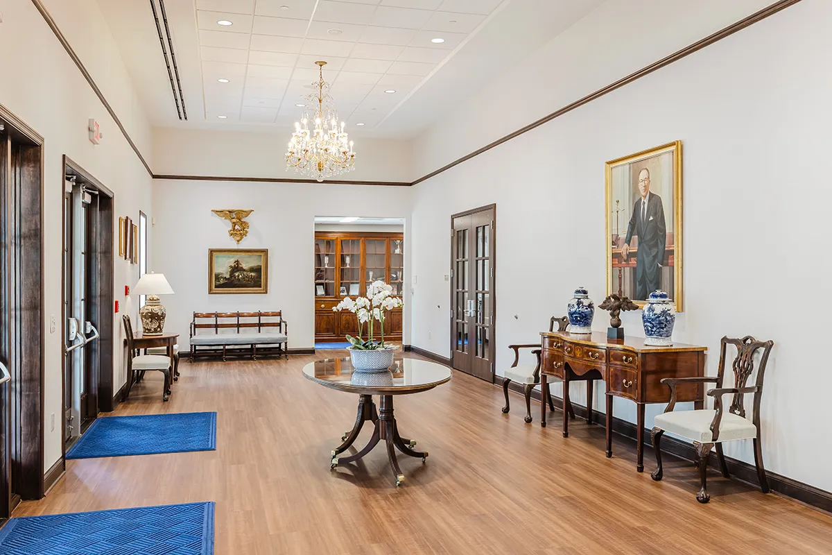 • Lobby: The lobby area is dedicated to Judge Griffin Bell, featuring 14-foot ceilings that showcase crystal chandeliers from the original building. Throughout the space, you'll notice artifacts and mementos honoring Judge Bell's legacy.